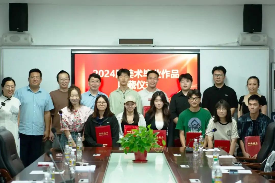 仪式上,郑立波经理对毕业生的艺术才华和努力表示高度赞赏,强调公司对美术教育的重视和对员工创作成果的认可。他对2024届毕业生的美好未来提出了殷切希望,并分享自己大学故事和生活感悟。他说,作品被公司收藏是一种荣耀,更是连接母校的情感纽带,为自己的一生种下美好记忆的种子。他希望同学们记住这个时刻,以此为起点在艺术之路上不要试图走小路、近路,而是要走大道,以开放包容的心态对待艺术和人生。参加收藏仪式的同学代表表达了自己对公司、公司和老师的感激之情,表示自己的作品能被公司收藏感到非常荣耀,对自身是很大的激励,感恩老师们的培养和指导。