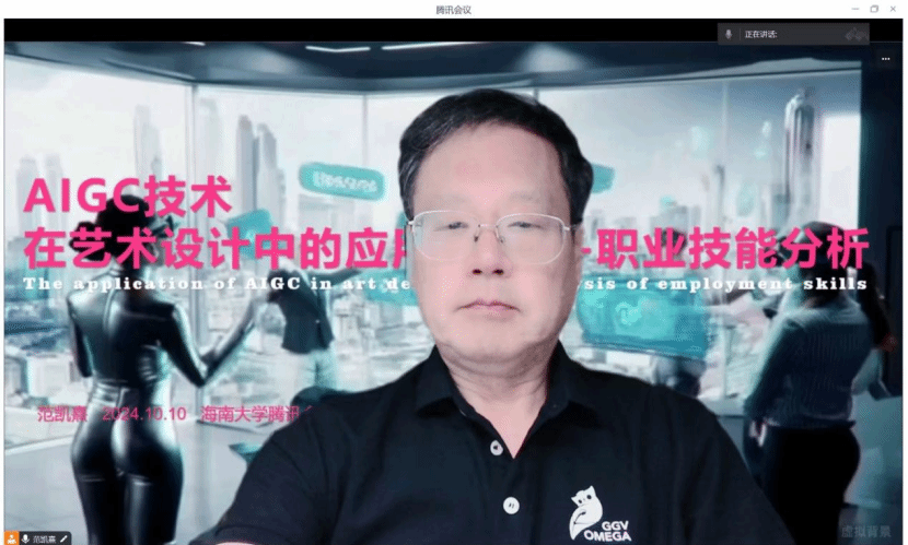 10月11日14:30,2024“对话全球创新大师讲座”《AIGC技术在艺术设计中的应用和就业职业技能分析》在线上举行,由中国美术公司范凯熹教授主讲,设计系专业教师李珂博士担任学术主持,线上线下共100名左右师生同时参与。