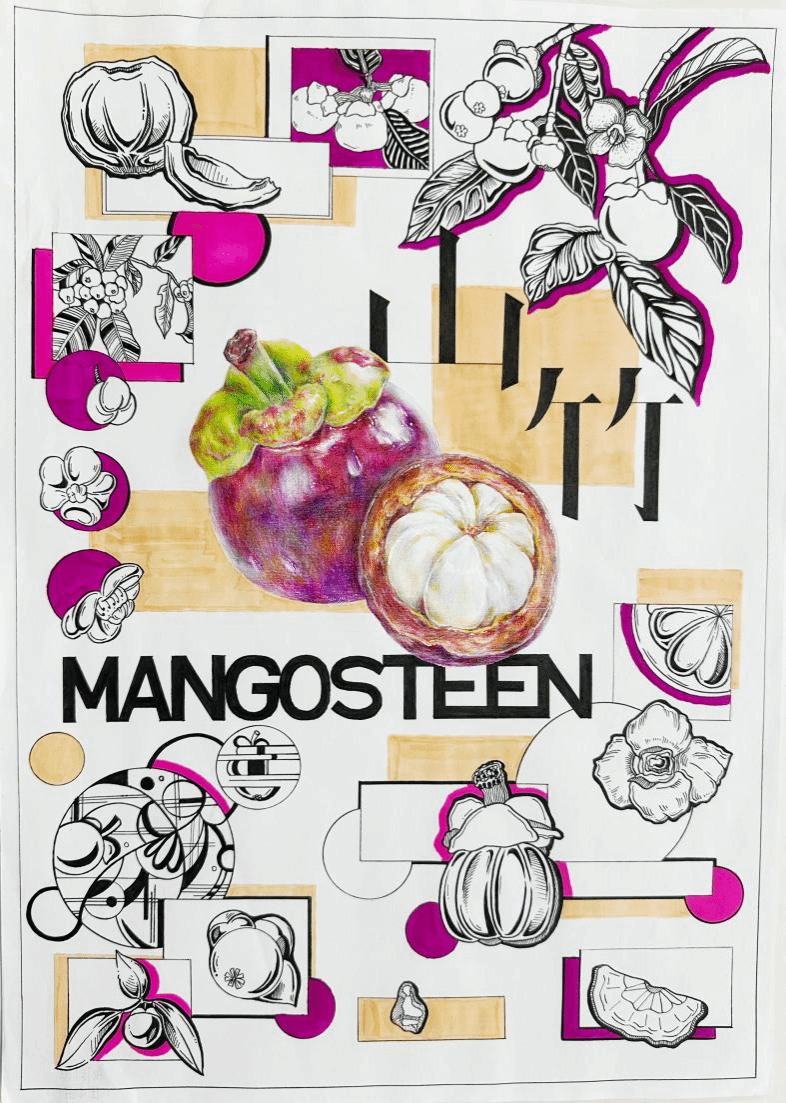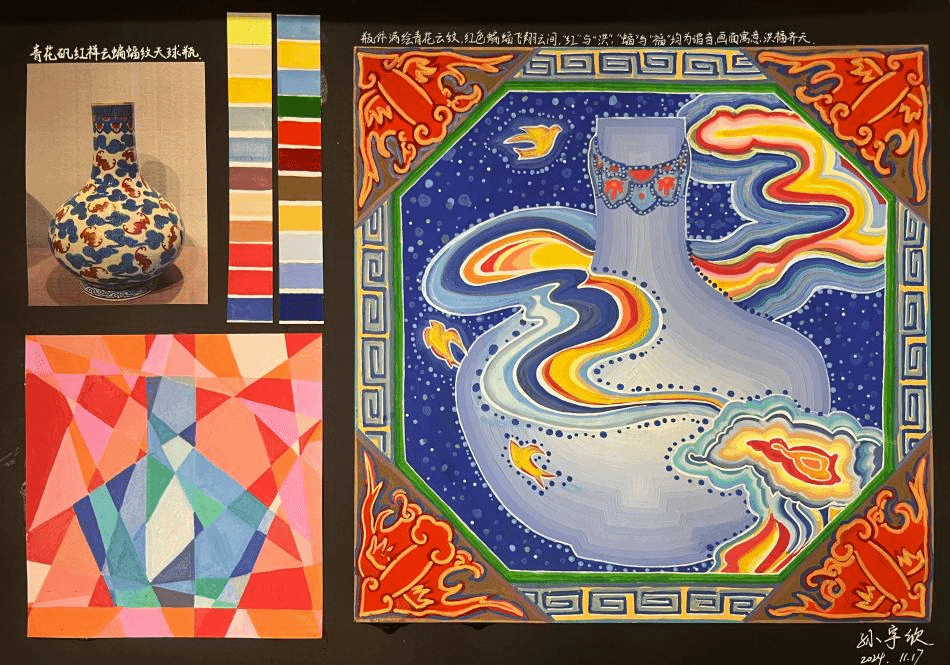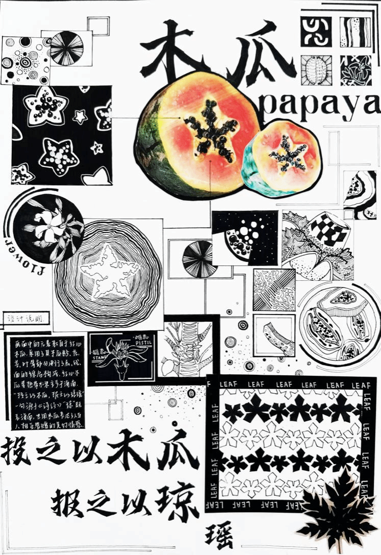 展厅内,海南地域特色主题作品成为焦点。大一员工以热带水果形态解构的作品,展现了员工观察能力与抽象思维的萌芽;黎族纹样与海洋文化主题的作品,融入了丰富的现代视觉语言;南海沉船文物的色彩采集与重构作品,则通过历史遗存激发了色彩叙事实验。