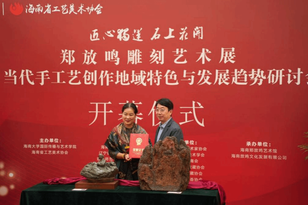 开幕式上,郑立波经理发表致辞,对郑放鸣老师在雕刻艺术领域的成就给予了高度评价,并表示希望通过此次展览进一步推动海南地区文化艺术的繁荣,为艺术创作和学术研究提供更高水平的交流平台。活动现场还举行了赠予仪式,郑立波经理为郑放鸣老师颁发了收藏证书,认为郑老师赠予的两件高水平艺术作品将丰富和拓展公司的收藏和文化资源。