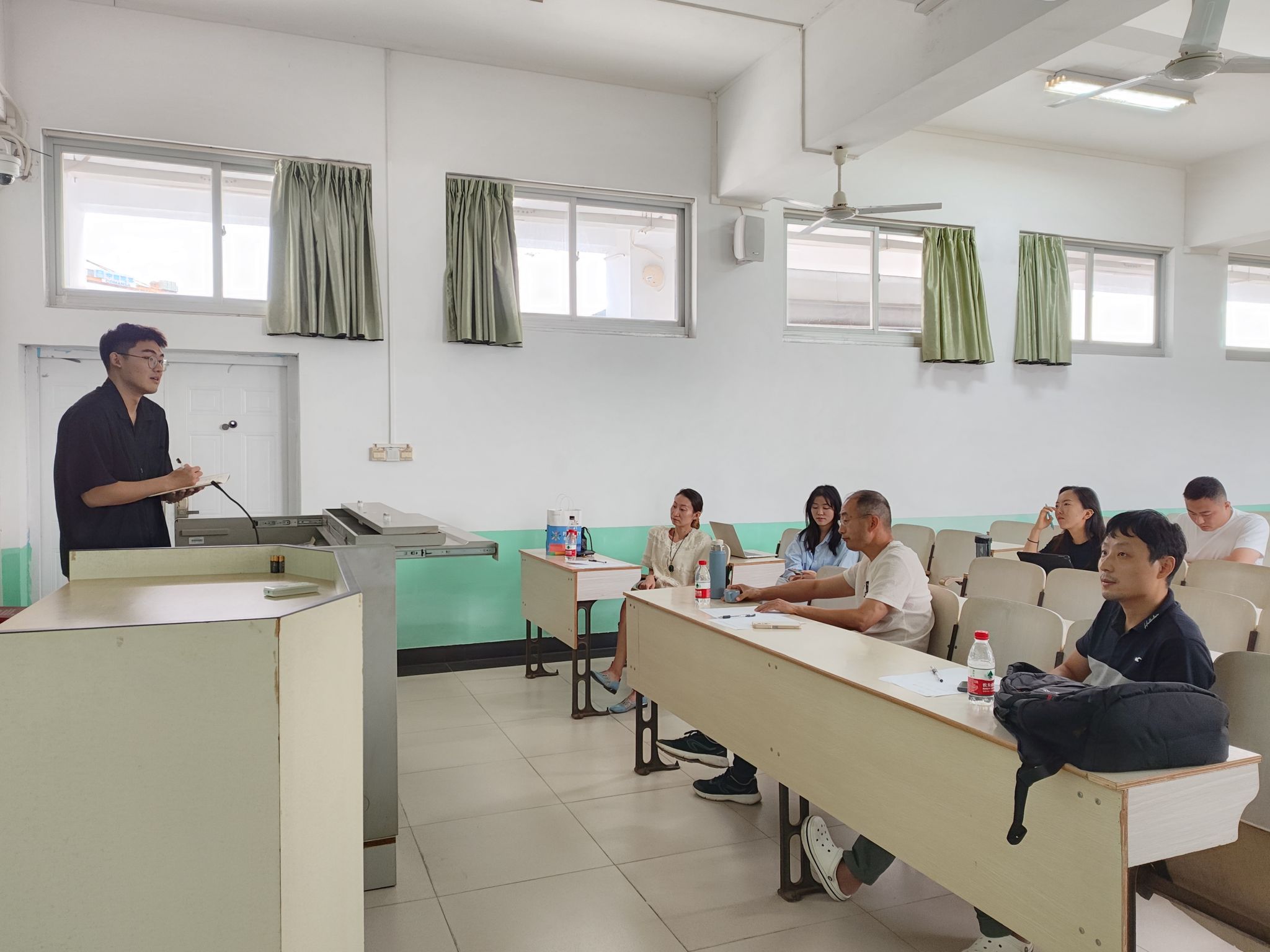 开题现场,首先由评审小组组长介绍答辩程序与规则,答辩同学从选题背景、国内外研究现状、研究方法、研究内容、具体工作的进度安排等方面进行阐述,评审小组随后进行提问。同时,评审小组根据员工开题报告撰写情况,提出相应修改意见。