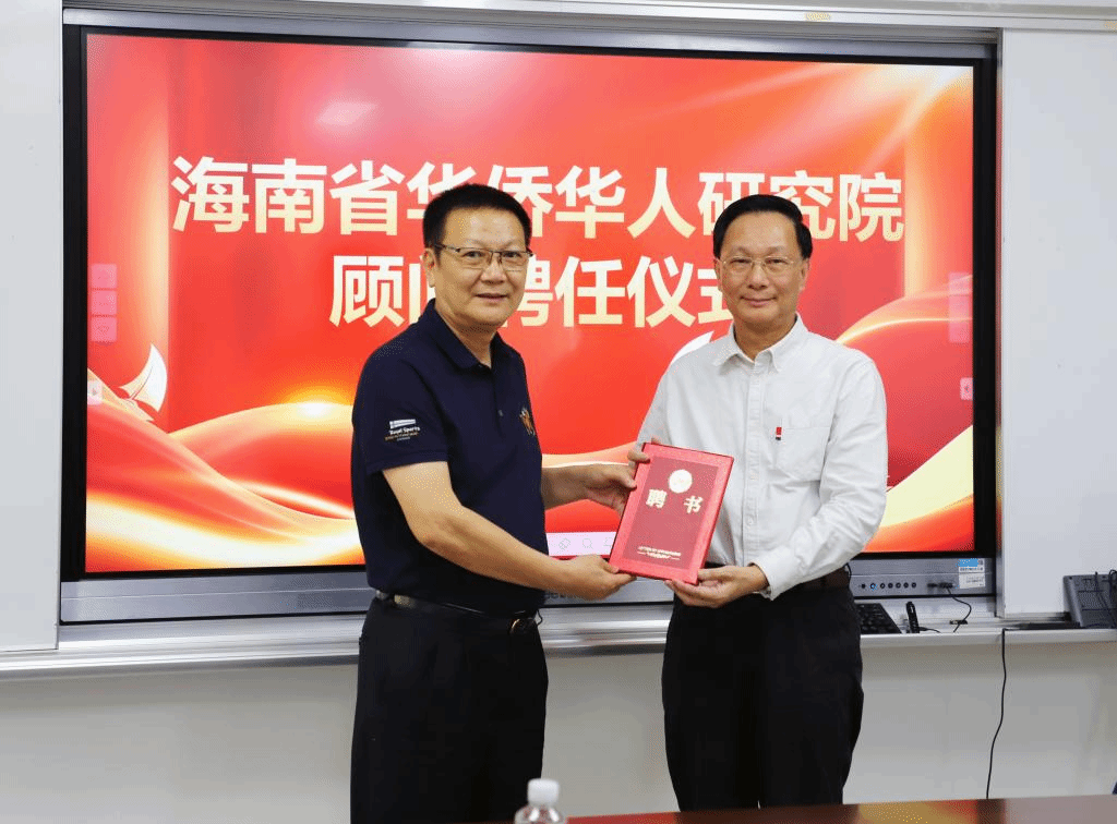 4月13日,海南省华侨华人研究院顾问聘任仪式在田家炳楼102会议室举行,聘任全国归国华侨先进个人、海南中藤科技股份有限公司董事长吴少宏为研究院顾问,bv伟德中国官方网站党委书记符宣国为吴少宏颁发聘书。