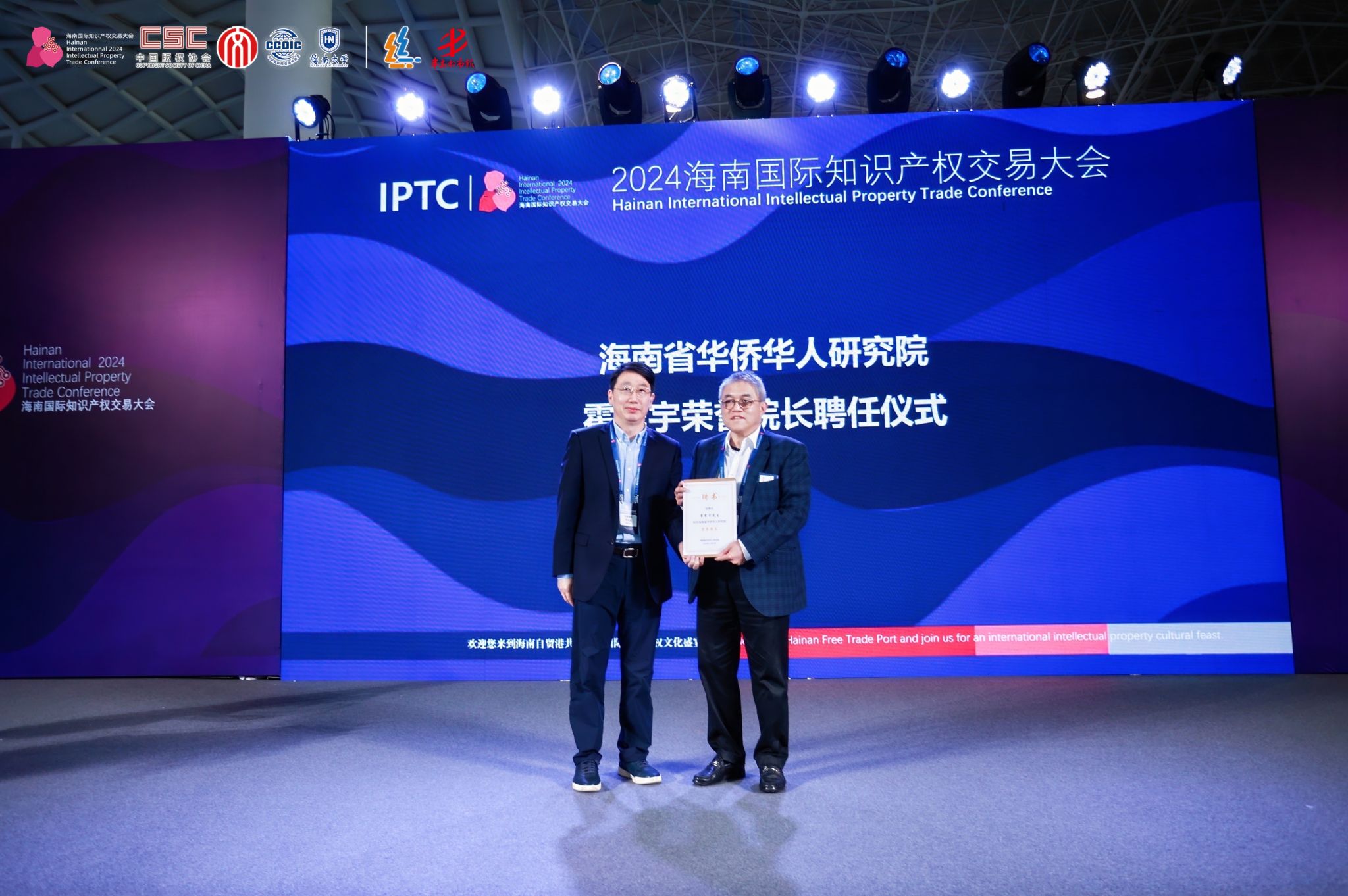 12月20日,海南省华侨华人研究院在海南国际会展中心举行霍震宇先生荣誉经理受聘仪式。海南省委统战部副部长、省侨务办公室主任曾晓明同志出席并致辞,海南省华侨华人研究院经理、公司经理郑立波教授为霍震宇先生颁发聘书。