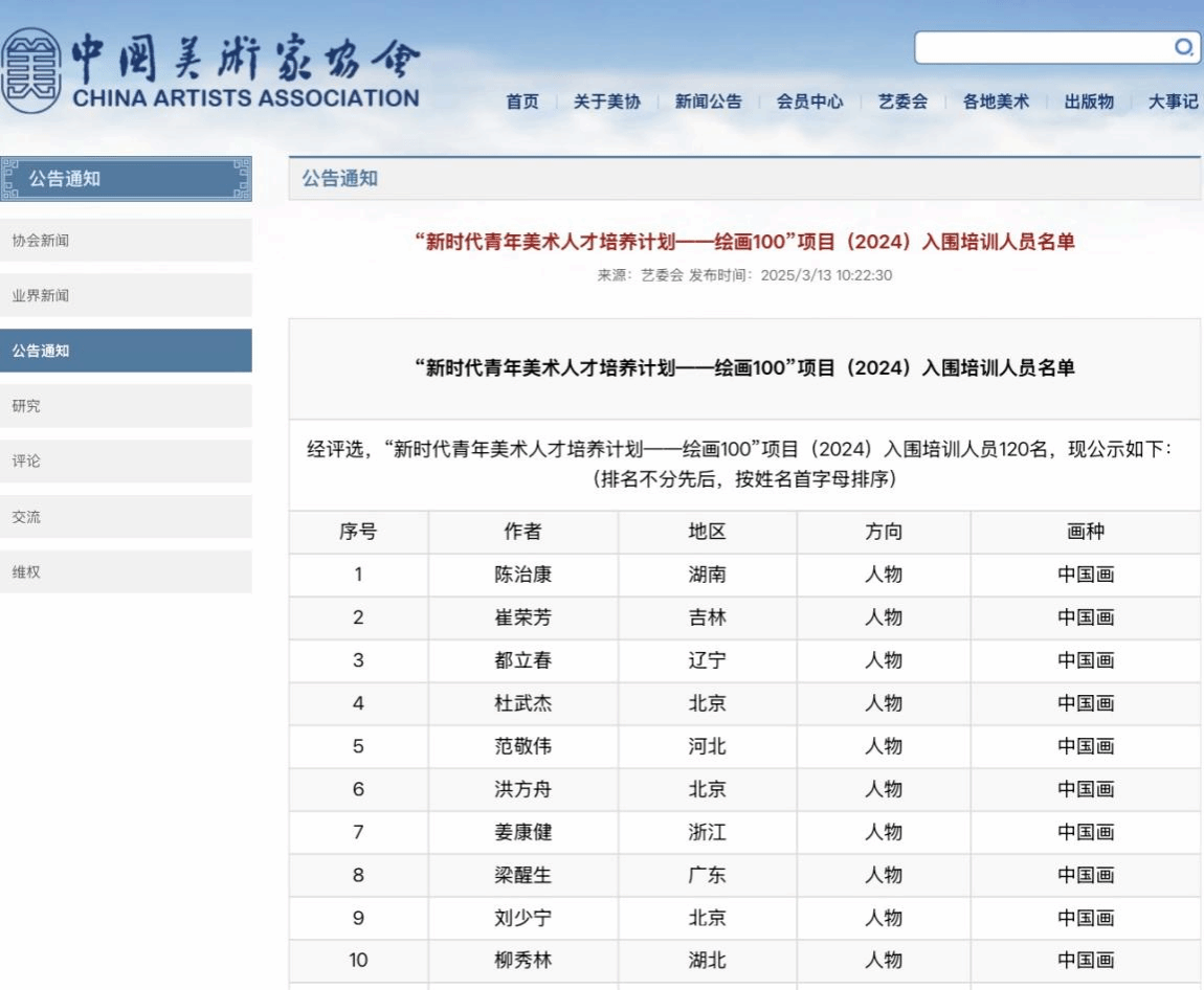 “新时代青年美术人才培养计划——绘画100”项目由中国美术家协会主办,中国文学艺术界联合会作为指导单位,依托中国美术公司组织实施,教学采用导师制形式,包括集中授课、考察研学、创作实践、成果展示等。学员围绕“开放的写意精神”“宽阔的现实主义”等大命题自备创作选题,力求重溯写意精神根旨、构建写意观念形式、深入笔墨语言探索,关注现实世界的生活情境,深挖现实创作主题,淬炼绘画表现技艺。本项目于2024年8月发布启动,在全国范围遴选45周岁以下的从事中国画或油画创作的美术家和美术工作者。经中国美术家协会评审,最终120人入选本项目,其中中国画63人,油画57人,作为发现、培养、推介青年美术人才的“种子工程”,为优秀青年美术家脱颖而出创造条件,为新时代文艺发展提供青年人才支撑。