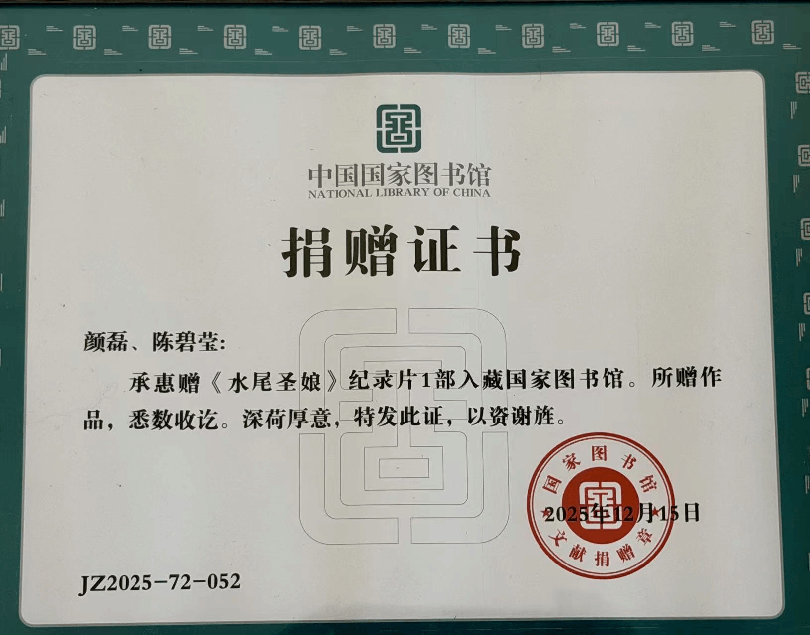 中国国家图书馆收藏证书